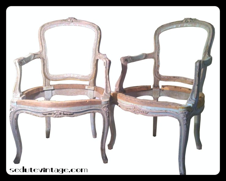 Aspettando di decidere sul tipo di rifinitura per la coppia di poltroncine a pozzetto che metterò in vendita su Etsy.com tra qualche giorno, ho iniziato a lavorare su queste poltroncine vintage stile Luigi XV….