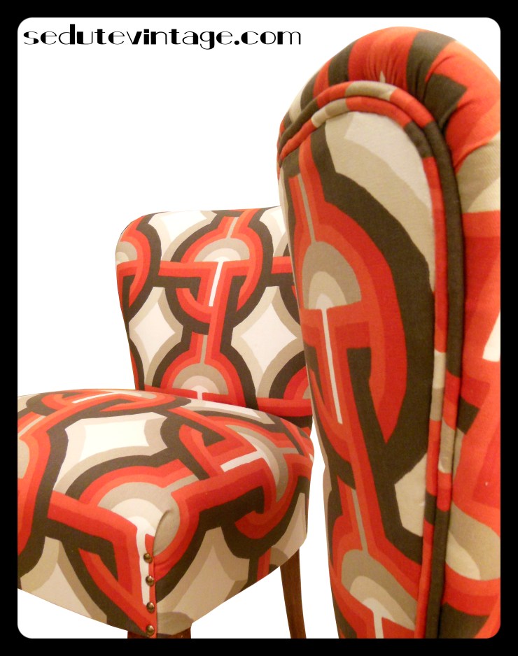 The brand new slipper chair set courtesy of MB&LGB has taken on a totally different look as it was reupholstered with a very particular 70s style fabric for the chairs and a neutral beige velvet imprime’ for the pouf. The dark aubergine legs were sanded and sanded again until returned to their natural color. They were then stained a warm light walnut.