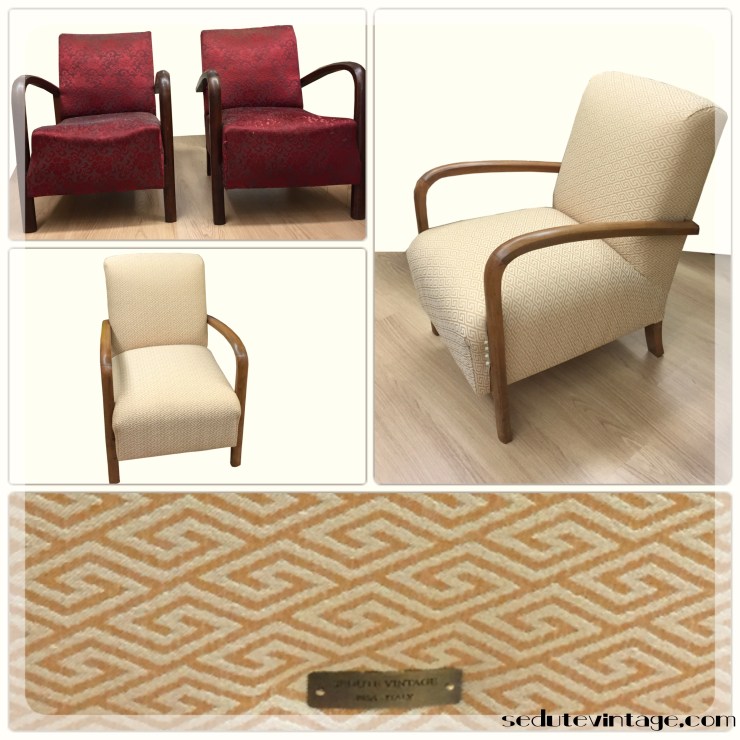 — This pair of Art Decò armchairs was found and bought on commission by the client. The wood was brought back to its natural color and then upholstered with a small geometric fabric —