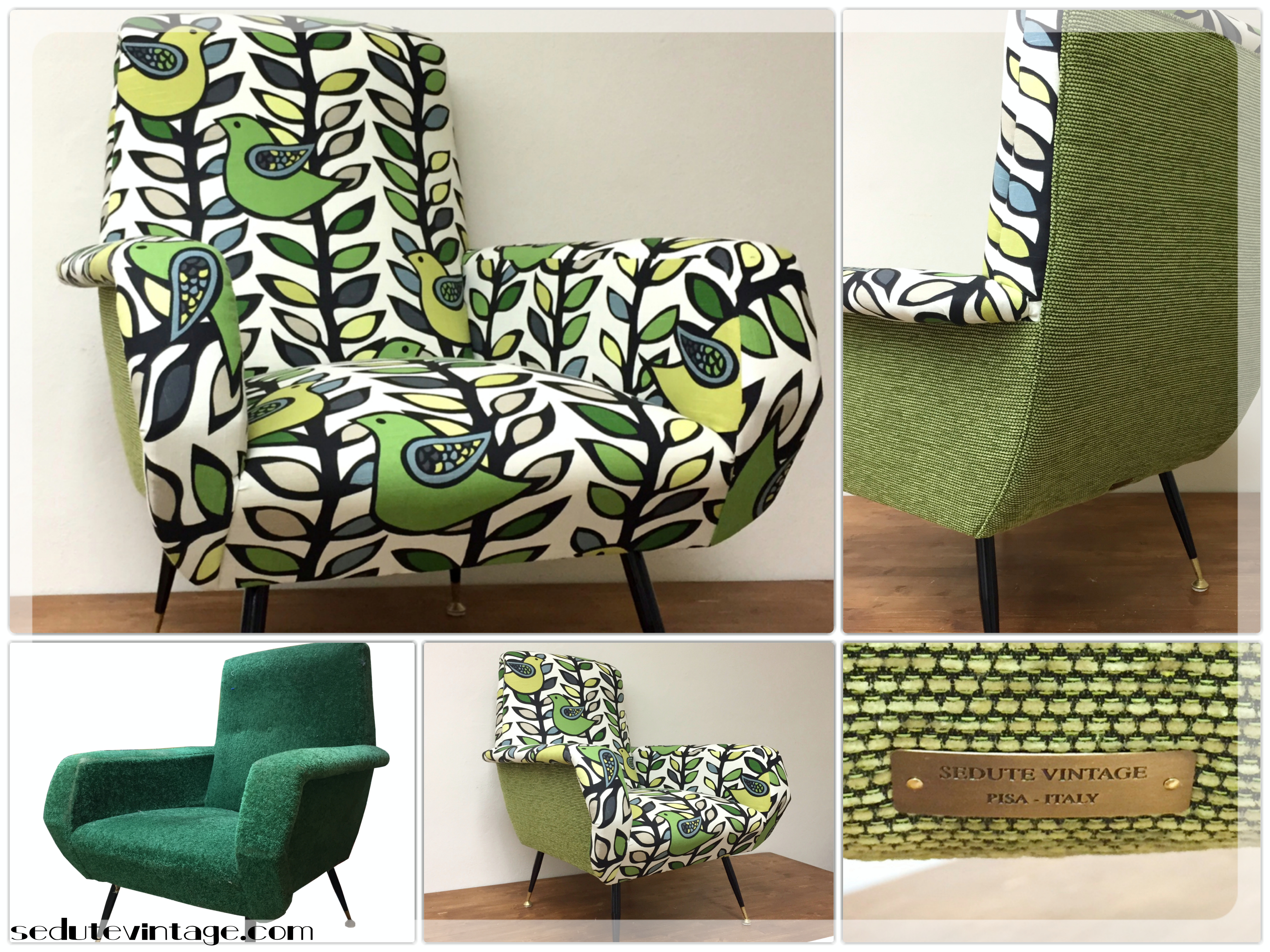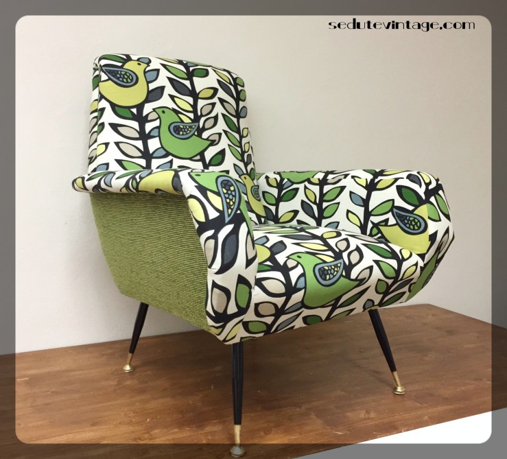 — Completed. Finished. Rather unique armchair, definitely a statement. And also very comfortable! 100% cotton for the BIRDS pattern. Chenille for the back and sides. The photos speak for themselves —