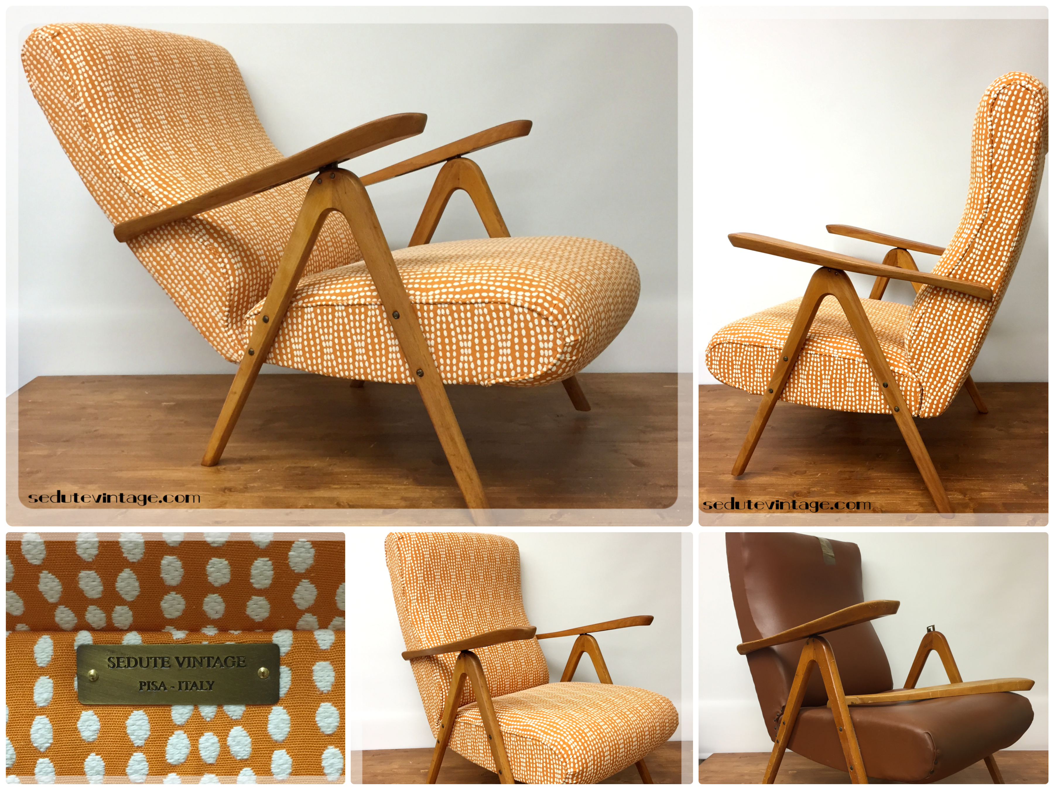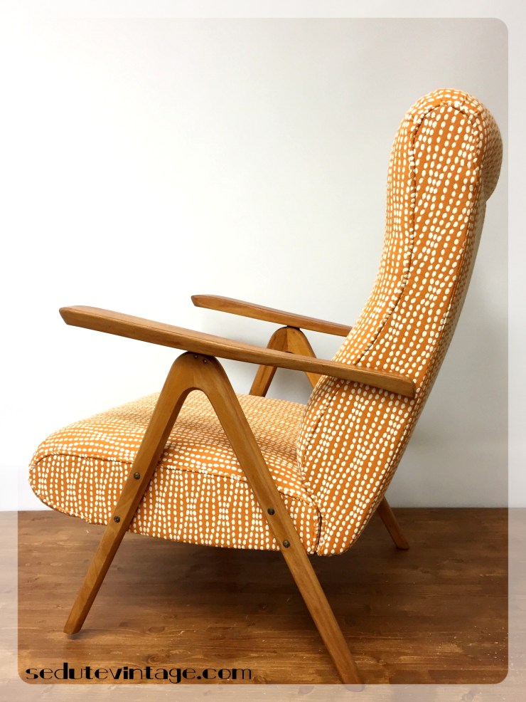 Orange fabric with a wavy geometric pattern & total restoration of the wooden parts: this 1950s comfortable relaxing reclining armchair is ready for its new home