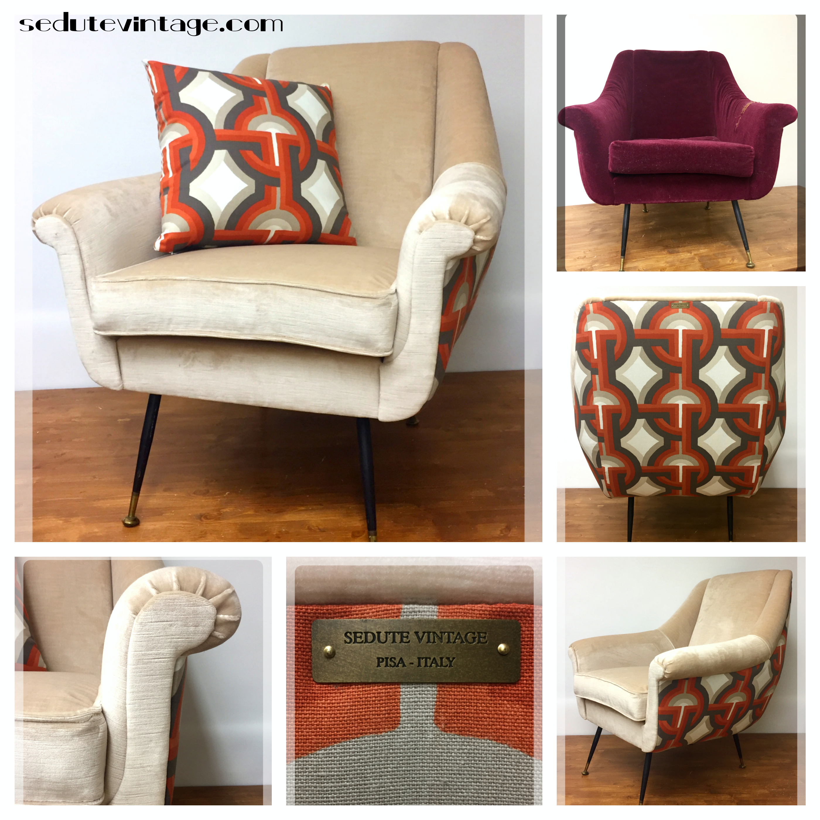 Reinterpretation of a lovely curvy 1950s armchair that brings together a solid velvet for the front with a 1970s pattern for the sides and back. The fabrics have been specifically selected to elegantly fit in its new environment.