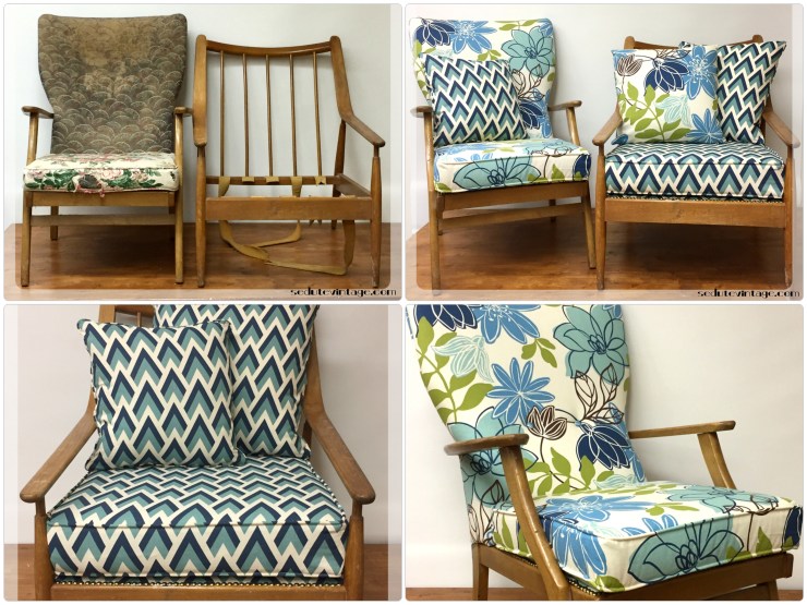 Reinterpretation of this pair of chairs with a large central bright colored damask-style fabric. Coordinated chevron fabric for the back. A cheerful combination!